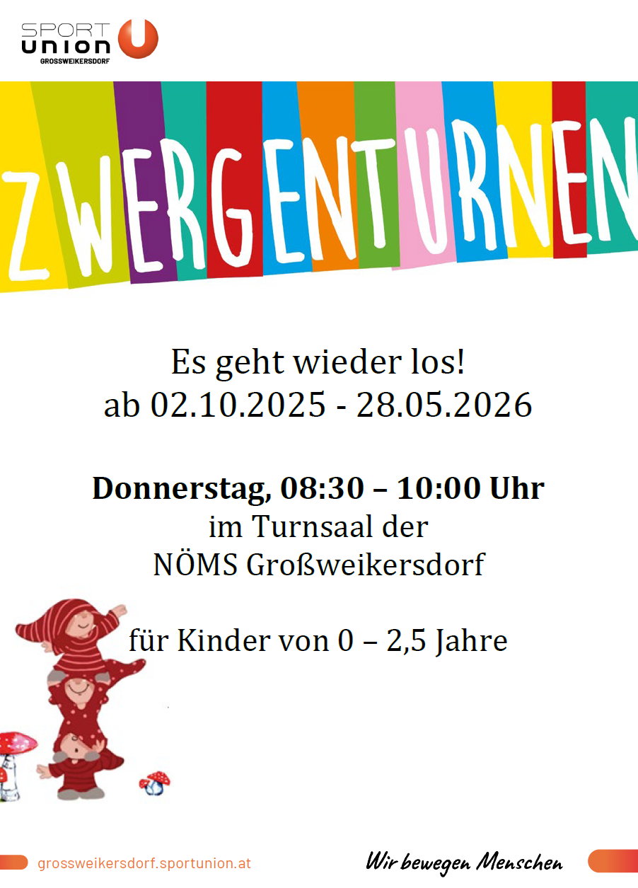Es geht wieder los! Ab 02. Oktober 2025 bis 28. Mai 2026 findet jeden Donnerstag von 08:30 – 10:00 Uhr das Zwergenturnen statt.